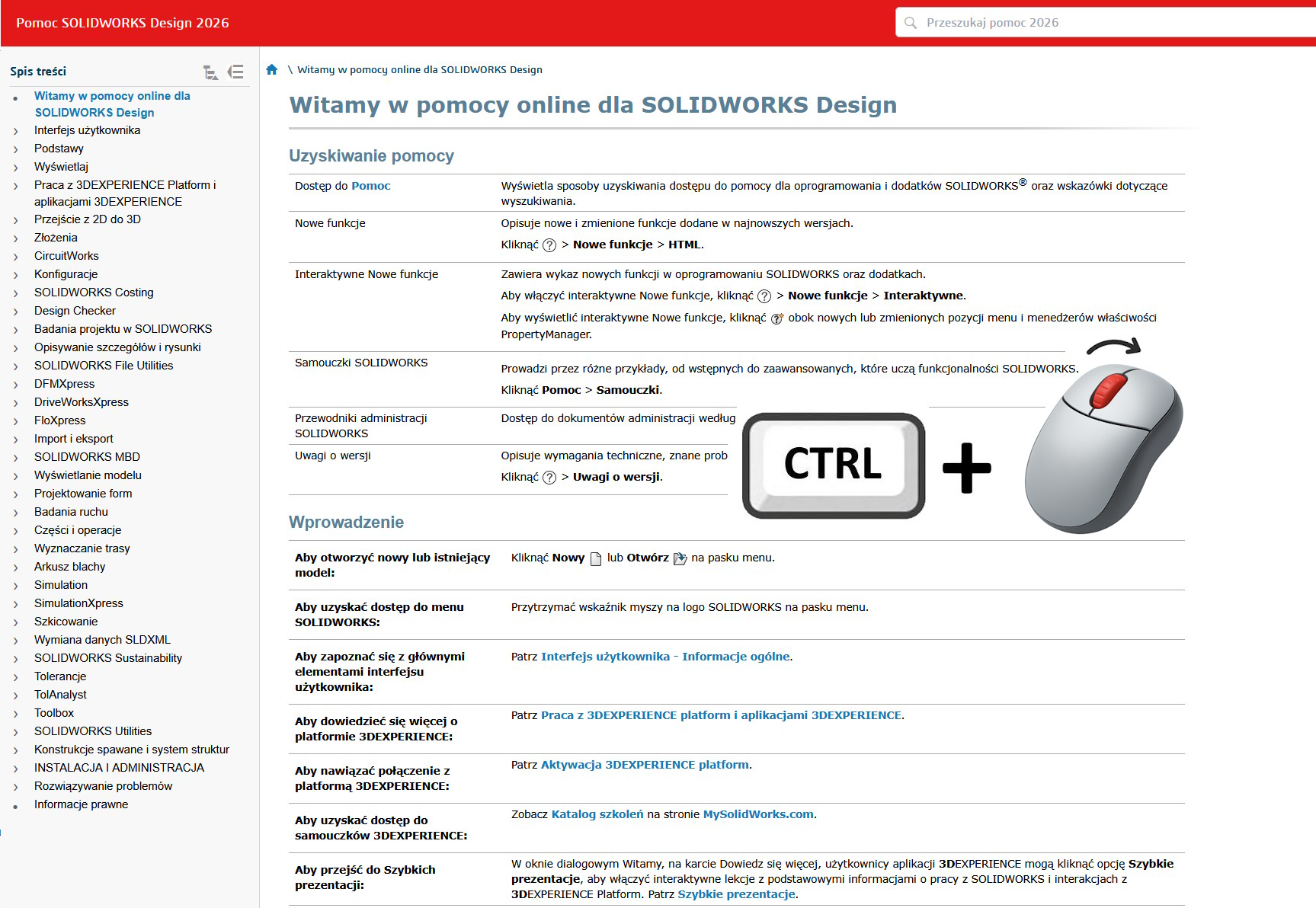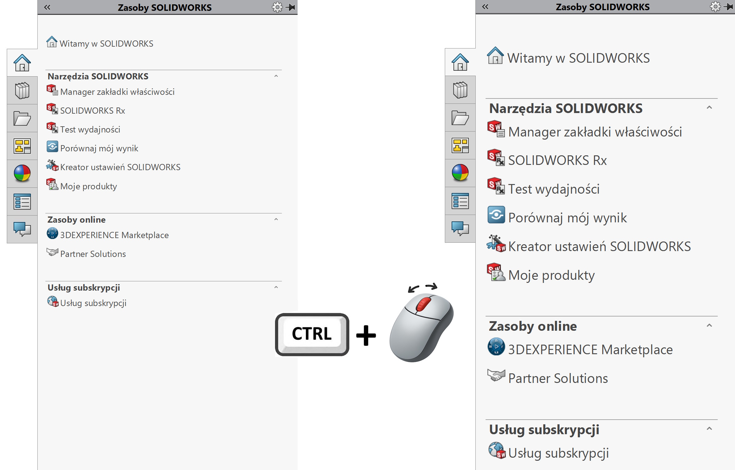 Wystarczy użyć skrótu Ctrl + scroll (czyli przytrzymać klawisz Ctrl i pokręcić kółkiem myszy), a tekst w panelach takich jak Zasoby SOLIDWORKS, Pomoc online, whether Samouczki zmieni swój rozmiar — bez potrzeby zmian w ustawieniach systemowych czy skalowania całego interfejsu.