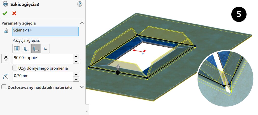 5. Finalne gięcie: Na nowym obiekcie dorysowuję linie gięcia i używam operacji Szkic zgięcia, aby uzyskać finalny kształt 90 stopni. Zwróć tutaj uwagę, iż powodzenie w tym kroku zależy od pozycji odgięcia oraz promienia. Im większy promień - linie muszą być przesunięte bardziej do wewnątrz.