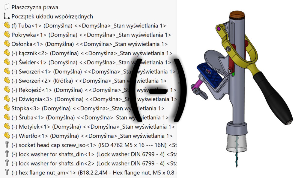 Jak powszechnie wiadomo, szkic niedodefiniowany zawiera przed nazwą oznaczenie (-). 你可以說, że analogicznie jest w złożeniach – części, które nie mają w pełni ograniczonych więzów posiadają identyczne oznaczenie (-).