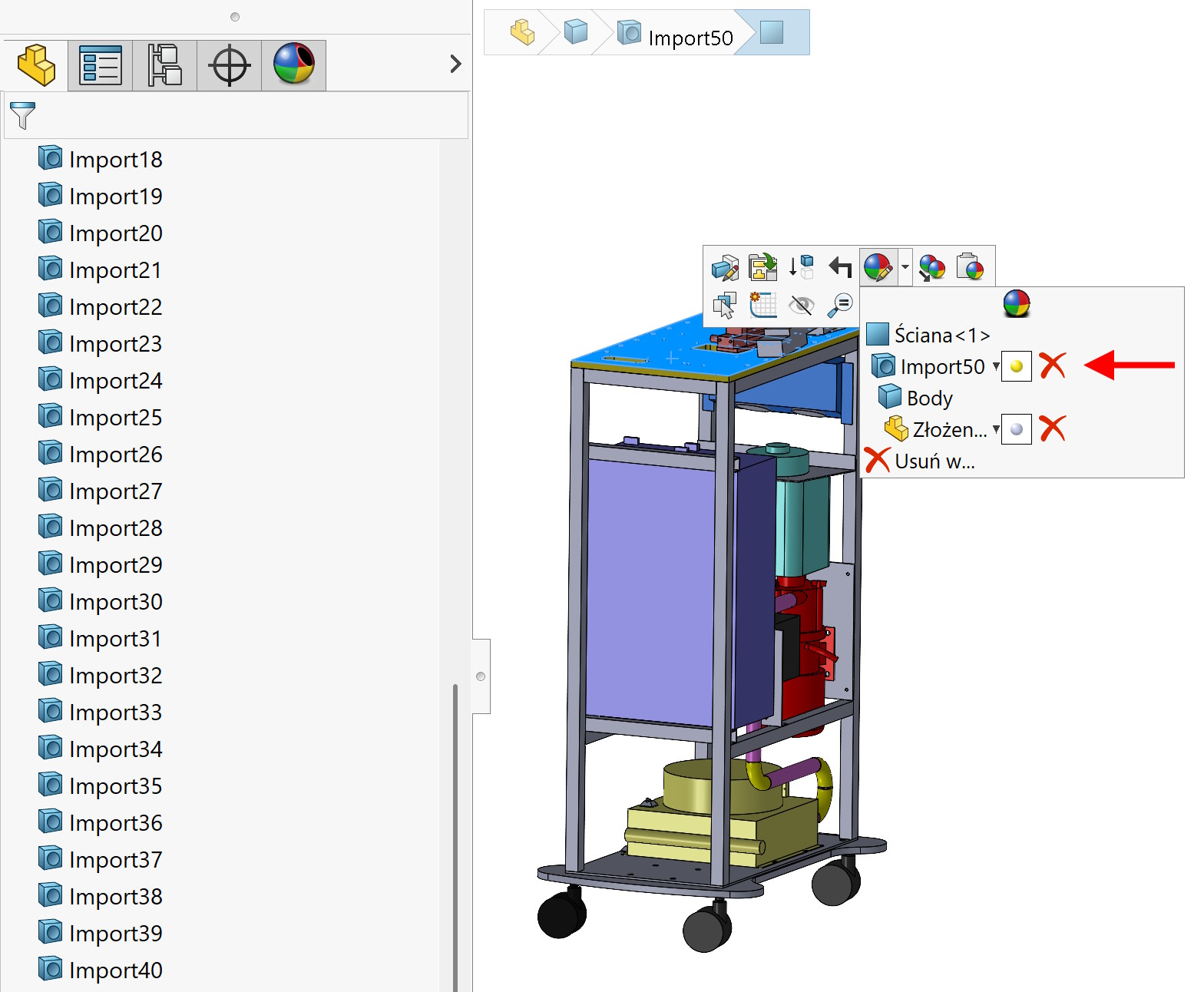 To sytuacja, z którą spotykasz się najczęściej: usuwasz wszystkie kolory z drzewa DisplayManager, a model nadal jest np. zielony/czerwony itp. Dzieje się tak, ponieważ kolory są przypisane do operacji importu w drzewie FeatureManager.