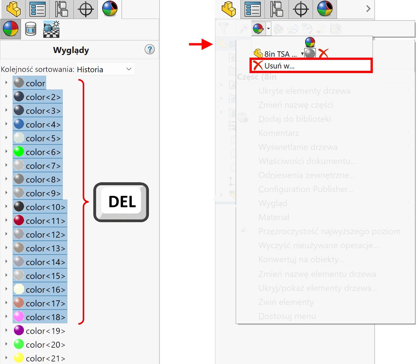 UWAGA! Jeśli masz do czynienia z dużym złożeniem, najskuteczniejszą metodą jest kliknięcie prawym przyciskiem myszy na najwyższy poziom złożenia i wybranie opcji Wyglądy > Usuń wszystkie wyglądy.