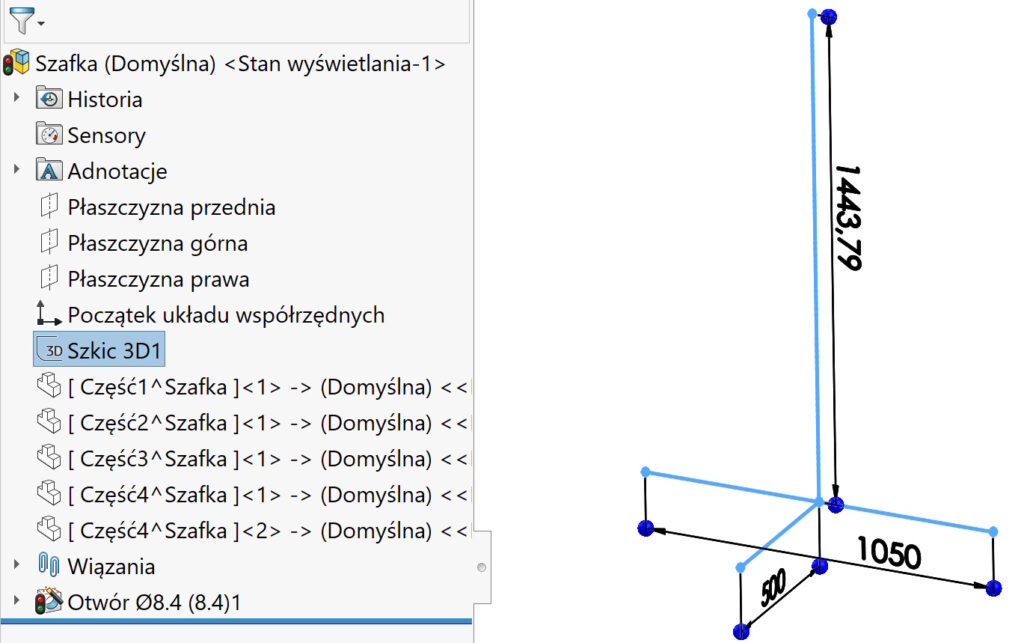 Wystarczy jeden dobrze przygotowany szkic 3D, który staje się bazą całej konstrukcji. Wszystkie części wstawiasz w kontekście, powiązane bezpośrednio z tym szkicem — dzięki czemu cały model reaguje na zmiany geometryczne w sposób automatyczny i przewidywalny.